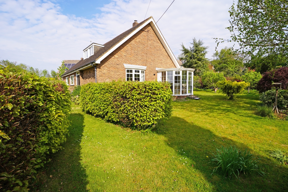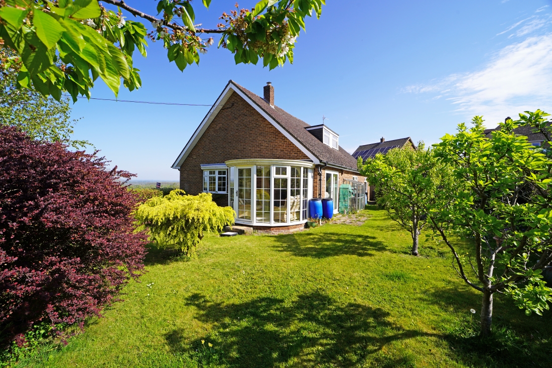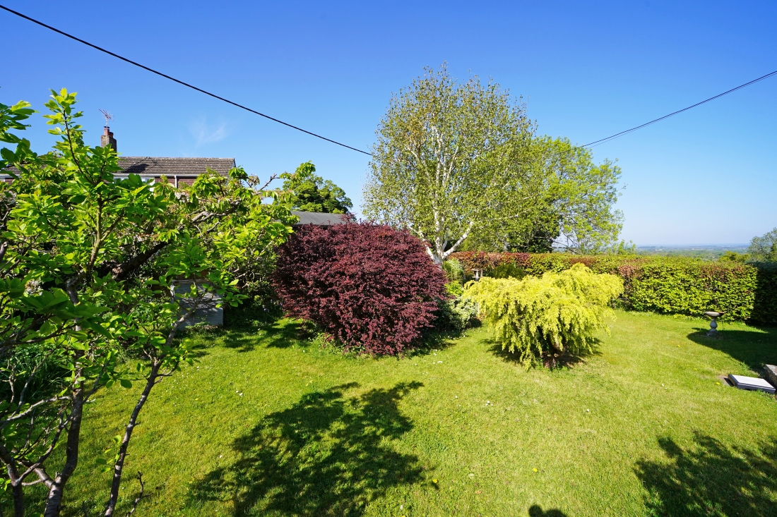 A rare opportunity to acquire an individually designed three bedroom detached bungalow situated on a good sized mature plot with gardens that surround the property. Set in an elevated position with picturesque far reaching rural views to the front the accommodation comprises: Entrance hall with access to a large boarded loft area with dormer windows to the front and rear, living room with patio doors to the garden, fireplace and an arch through to the conservatory with a door to the garden, dining room with views to the front, fitted kitchen with built-in oven, microwave and hob with extractor over, hatch to the dining room, door to a covered area with outside W.C. and a cupboard with plumbing for washing machine, bathroom with bath and separate corner shower cubicle and three double bedrooms; all with fitted wardrobes. The property also benefits from gas radiator central heating and double glazing. Outside there is a block paved driveway providing parking for several vehicles leading to a detached garage with power, light, electric roller door and personal door to the garden. The well maintained gardens surround the property which are mainly laid to lawn with an extensive selection of trees and bushes, patio area, vegetable garden and fruit trees. The spacious loft presents an excellent opportunity to expand the living space, making full use of the dormer windows at both the front and rear of the property.
